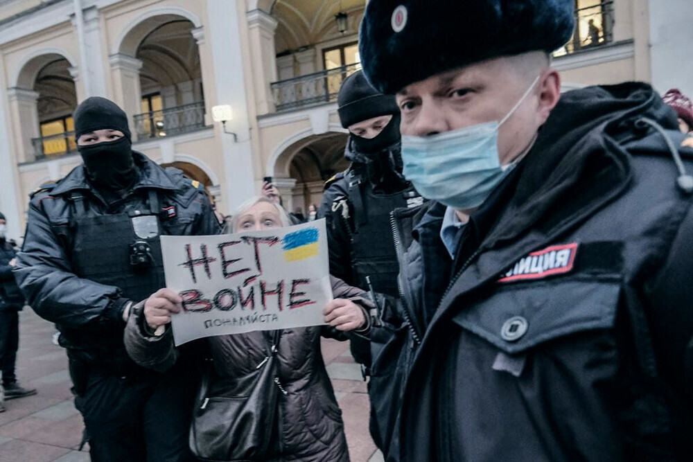 Вот говорят: на пикетах и митингах — агрессия… А какая там агрессия? Конституция всем россиянам гарантирует право собираться мирно, без оружия и проводить митинги, пикеты, демонстрации и шествия. Вот и я пришла [24 февраля] к станции «Гостиный двор», а там девочки стоят и боятся развернуть плакат, на котором написано «Нет [запрещенное в РФ слово]». Я его взяла и развернула. Меня полиция с этим плакатом и повела в автозак.